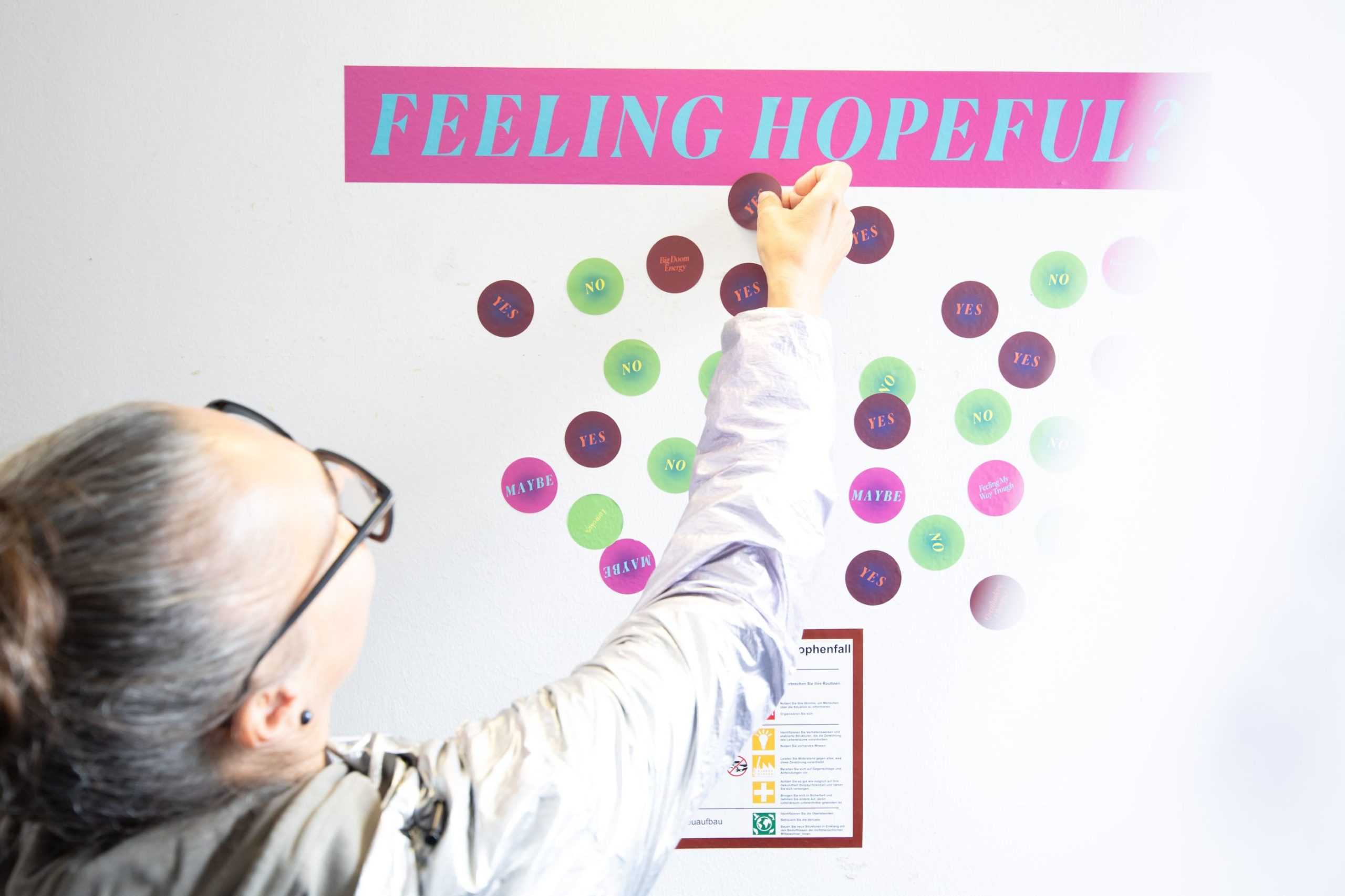 Огромни зидови преплављени црвеним, жућкастим или зеленим налепницама које посетиоци остављају тешко је игнорисати. Гледајући те одговоре, не само да се подсећамо да нисмо сами, већ имамо и прилику да завиримо у један велики друштвени експеримент који се одвија директно пред нашим очима. Арс електроника већ годинама изнова проналази нове начине да изађе из форме затворене, једносмерне изложбе и отвара простор за колективни дијалог.
